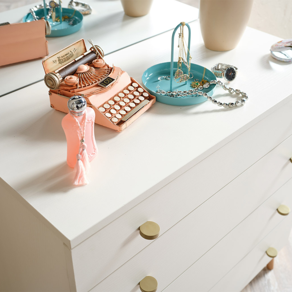 تسريحة لورينا تمزج بين الأناقة والعملية؛ فهي توفر لك مساحة مثالية لتنظيم مستلزماتك اليومية مع تصميم أنيق يعكس الفخامة والرقي. تتميز بتفاصيل متقنة وألوان هادئة تضفي لمسة من الراحة والسكينة على أي غرفة.