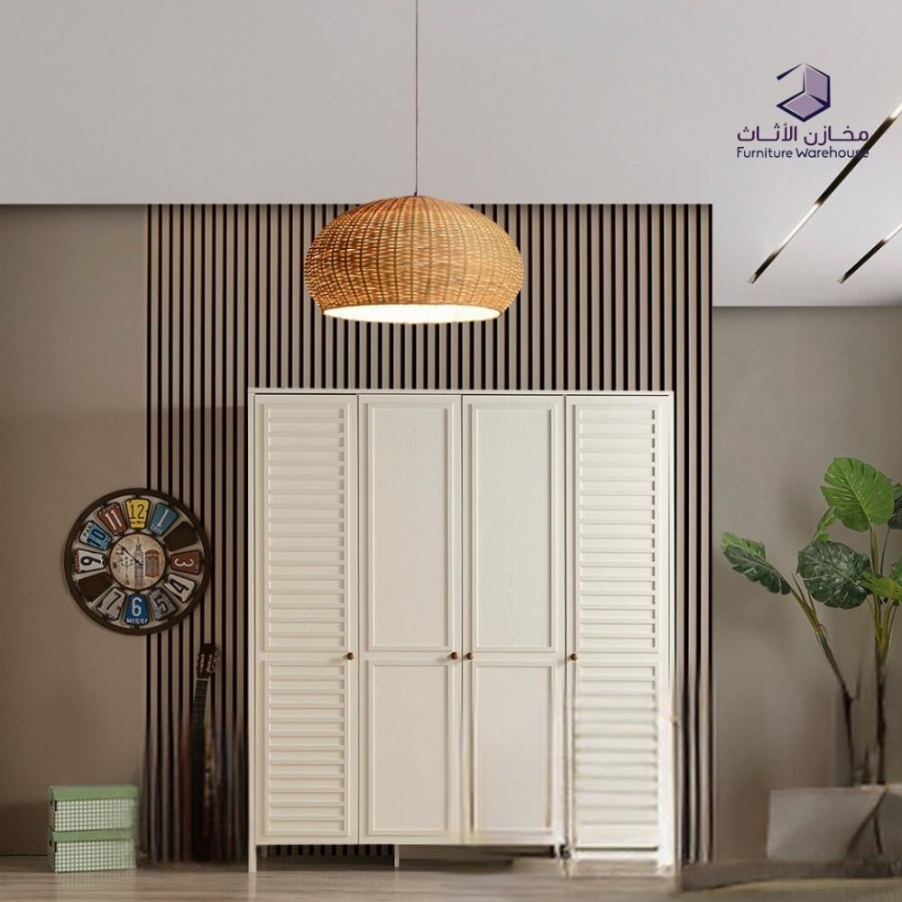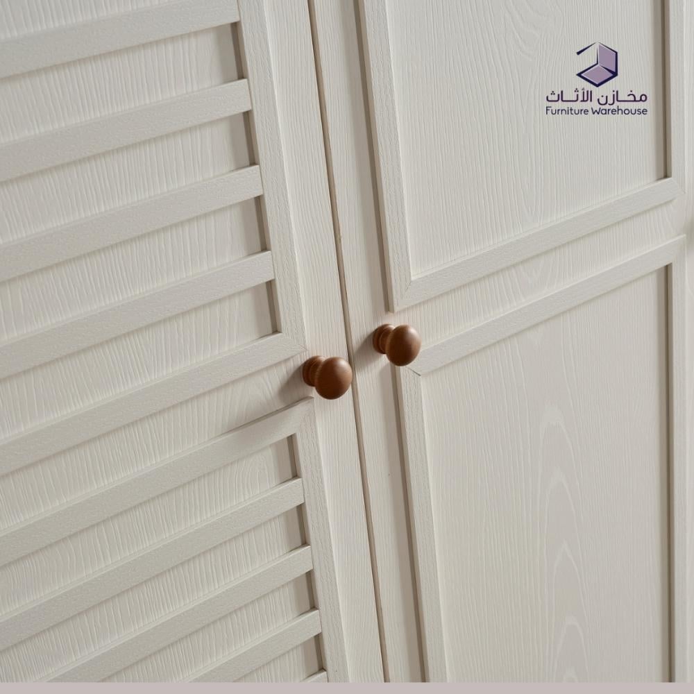دولاب ملابس أنيق بأربعة أبواب، مصمم بلون هادئ ويمتاز بأبوابه التي تحتوي على خطوط أفقية إضافةً إلى مقابض خشبية دائرية بلون مغاير تمنحه مظهراً عصرياً.